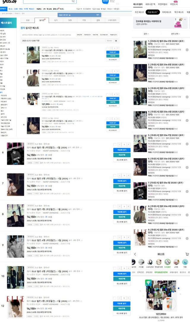 알라딘에서는 잡지 부문 실시간 베스트 1위부터 9위까지 줄 세우기를 기록했다. 지마켓에서도 취미실용·잡지·만화 부문에서 정국 커버 9종 세트가 베스트 상품 1위에 올랐다. 엘르 2026년 1월호는 예스24, 알라딘, 지마켓 모두에서 베스트셀러 1위를 차지하며 흥행 파워를 입증했다.
