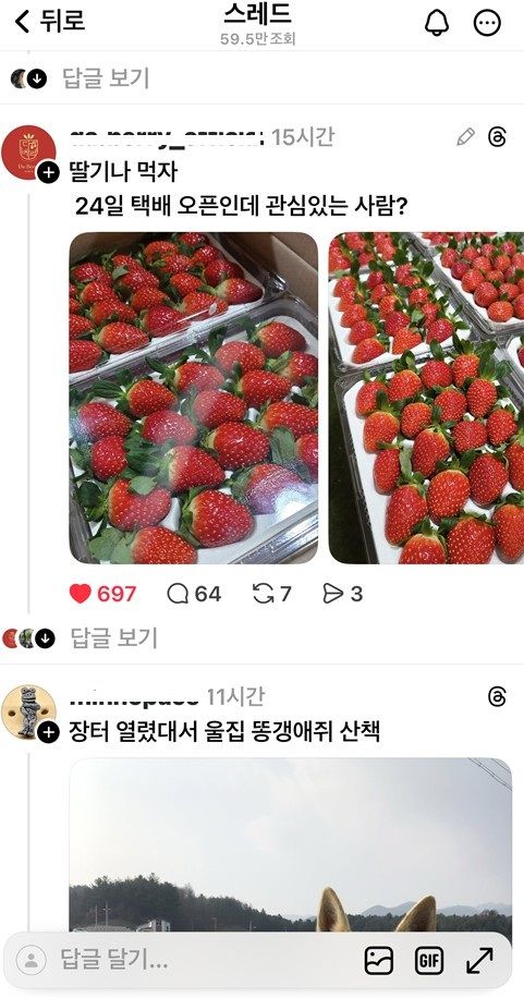 A씨는 “스레드에서 논란의 글이 올라오면 댓글창을 활용해 물건을 홍보하는 온라인 문화를 ‘스레드 장터’라고 하더라”며 “딸기부터 화장품·약과·카페·펜션·빵집 홍보는 물론 자기가 키우는 반려견 전단지까지 댓글로 알리는 걸 보면서 SNS가 만들어낸 또 다른 커머스 문화라는 생각이 들었다”고 했다.