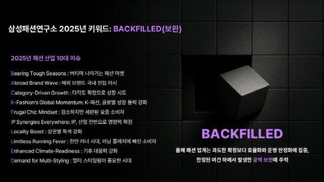 임지연 삼성패션연구소장은 “2025년 국내 패션 업계는 과도한 확장보다 효율화, 안정적인 운영에 주목했고, 이는 글로벌 불확실성과 부진한 내수 환경이 배경으로 작용했다”면서 “어려운 경영환경에 따라 발생한 공백을 ‘보완’하기 위해 노력한 한 해로 평가한다”고 말했다.