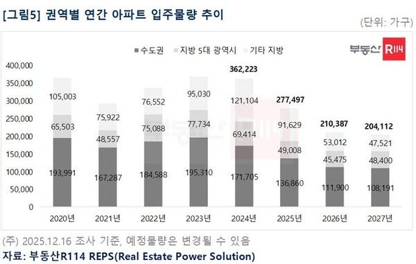 내년 전국 아파트 신축 입주 물량이 올해보다 6만 가구 이상 급감하며 주택 공급 위축이 본격화될 전망이다.