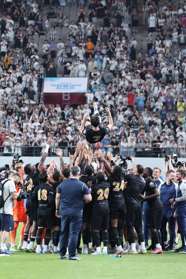 | 손흥민이 8월 3일 서울월드컵경기장에서 열린 2025 쿠팡플레이 시리즈 뉴캐슬 유나이티드와의 친선경기가 끝난 뒤 동료 선수들로부터 헹가래를 받고 있다. 사진=연합뉴스 |