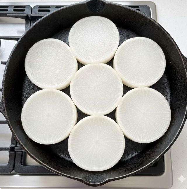 조리 방법은 어렵지 않다. 프라이팬이나 오븐, 에어프라이어 모두 가능하다. 팬에 구울 경우 약한 불에서 천천히 익히는 것이 핵심이다. 처음부터 센 불을 쓰면 겉만 타고 속은 설익는다. 기름은 아주 소량만 사용해도 충분하다. 무 자체에서 수분이 나오기 때문에 눌어붙을 걱정도 크지 않다.