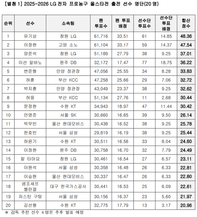 이번 올스타 출전 선수는 팬 투표 70%와 선수단 투표 30%를 합산해 선발했다. 팬 투표는 지난 4일부터 17일까지 진행됐다.