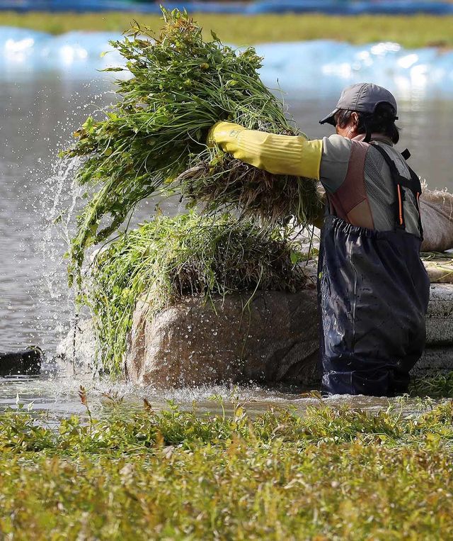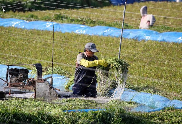 17일 부산 기장군 철마면의 한 미나리꽝에서 농민이 겨울철 입맛을 돋우는 미나리를 수확하고 있다. / 뉴스1