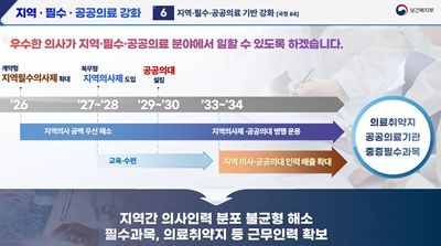 지역·필수·공공분야 의료인력의 안정적 공급을 위해 지역필수의사제를 2025년 4개 시·도에서 2026년 6개 시·도로 확대하고, 지역의사제와 공공의대 설립을 추진한다.