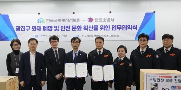 한국사회보장정보원은 17일 본원에서 서울 광진소방서와 지역사회의 화재 예방 및 안전문화 확산을 위한 업무협약(MOU)을 체결했다고 밝혔다.