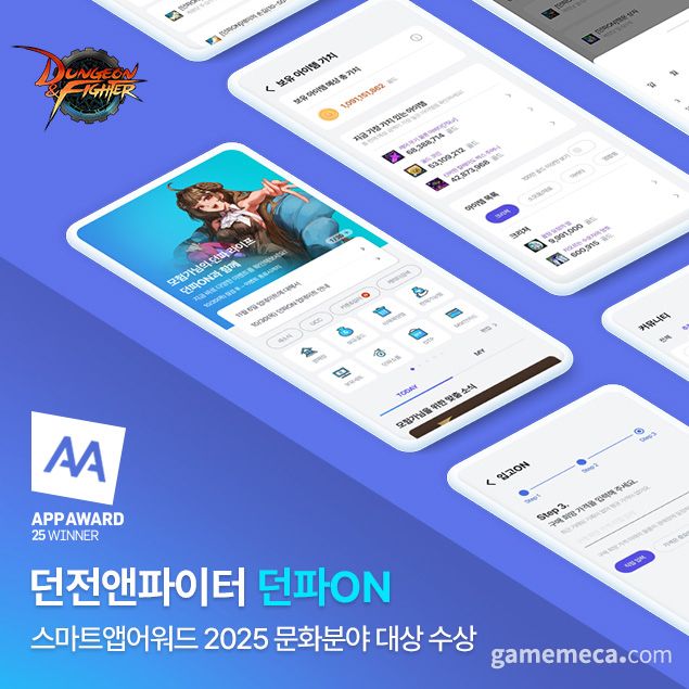던전앤파이터(이하 던파) 공식 모바일 앱 '던파ON'이 스마트앱어워드 2025에서 문화분야 대상을 수상했다. 한국인터넷전문가협회가 주최하는 스마트앱어워드는 인터넷 전문가 4,000여 명으로 구성된 평가위원단이 비주얼 디자인, UI 디자인, 기술, 콘텐츠, 서비스, 마케팅 등 6개 부문 18개 평가지표를 토대로 우수한 모바일 앱을 선정하는 시상식이다. 던파ON은 던파 이용자가 게임에 접속하지 않아도 캐릭터 성장 현황과 자산 가치를 실시간으로 확인할 수 있는 공식 모바일 앱이다