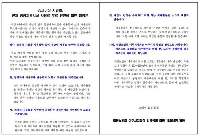 이번 조례 개정안은 65세 이상 시민과 장애인에게 공공체육시설 사용료를 전액 무료화하는 내용을 담고 있었으나, 대한노인회 여주시지회는 입장문을 통해 전면 무료화보다는 현행 감면 제도의 유지가 바람직하다는 분명한 입장을 밝혔다.