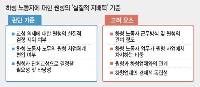 법원이 이들 원청을 하청 노조의 실질적 사용자라고 판단하며 제시한 기준은 △교섭요구 의제에 대해 원청이 실질적이고 구체적으로 지배·결정하는 지위에 있는지 △하청 노동자들의 노무가 원청의 사업 수행에 필수적이고 사업체계에 편입돼 있는지 △하청 노동자들의 노동조건 등을 원청과의 단체교섭으로 결정할 필요성과 타당성이 있는지 등 3가지다.