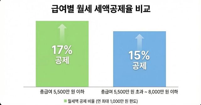 그렇다면 실제로 얼마나 돌려받을 수 있을까. 소득 수준에 따라 공제율이 두 구간으로 나뉜다. 총급여가 5,500만 원 이하(종합 소득금액 4,500만 원 이하)인 근로자는 월세액의 17%를 공제받는다. 반면 총급여가 5,500만 원을 초과하고 8,000만 원 이하(종합 소득금액 7,000만 원 초과자 제외)인 경우에는 15%의 공제율이 적용된다.