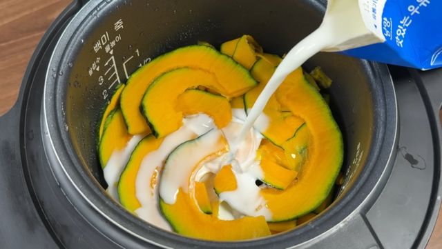 단호박에 우유를 붓는 모습 / 유튜브 '집나간아들'