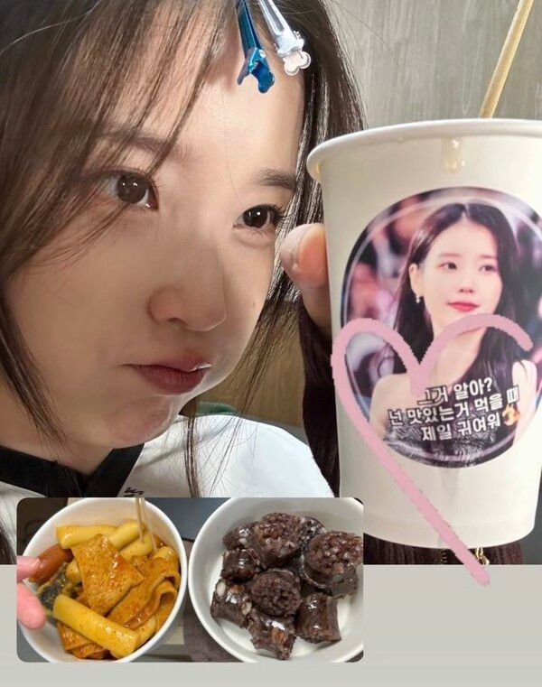 사진 속 아이유는 간식차 앞에서 손하트 포즈를 하고 있다.
