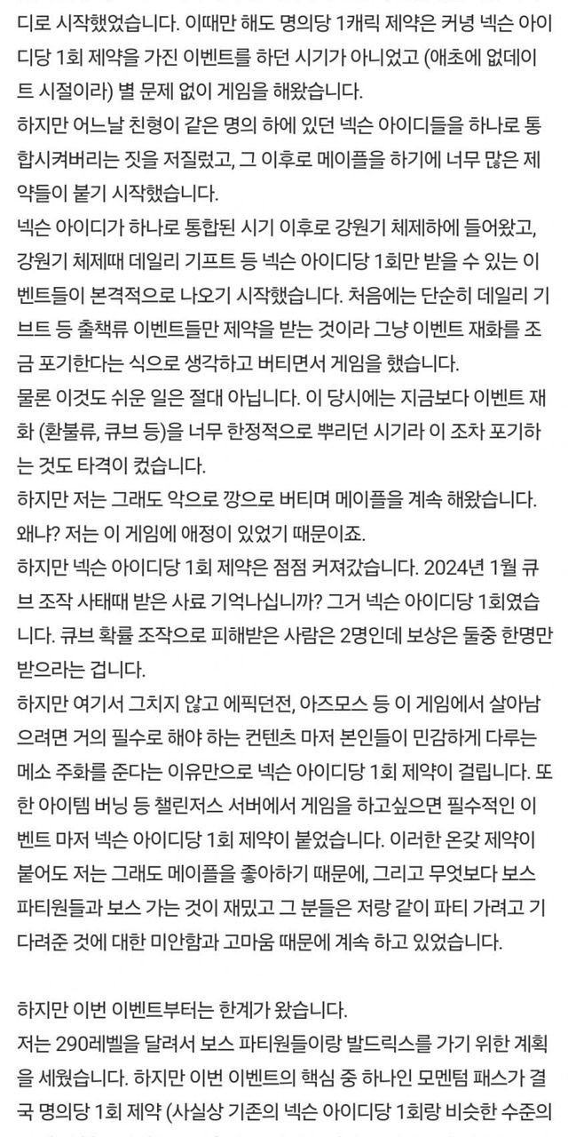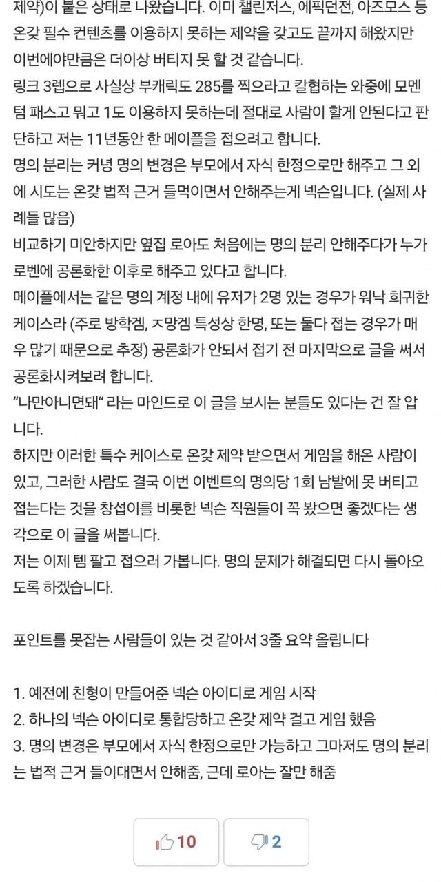 창섭이형이 다계정 쌀먹 막으려고 컨텐츠들 죄다 명의당 1회로 바꿈