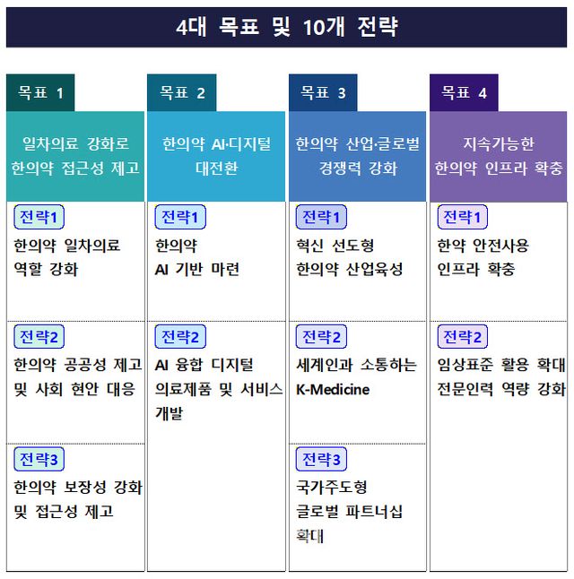 제5차 종합계획은 AI·한의약 혁신을 통한 ‘국민건강 증진’과 ‘한의약 산업 경쟁력 강화’를 비전으로 설정하고, 일차의료 기반 건강 돌봄 수요 충족과 한의약 산업발전 육성·시장 확대에 대한 5개년 발전 방향을 제시했다.