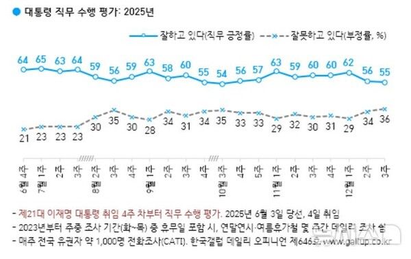 뉴시스 보도에 따르면, 한국갤럽이 지난 16~18일 전국 만 18세 이상 1001명을 대상으로 이 대통령이 현재 대통령으로서의 직무를 잘 수행하고 있다고 보는지 물은 결과 '잘하고 있다'는 긍정 평가는 55%로 직전 조사 대비 1%포인트 하락했다. '잘못하고 있다'는 부정 평가는 36%로 지난주보다 2%포인트 상승했다. 9%는 의견을 유보했다.
