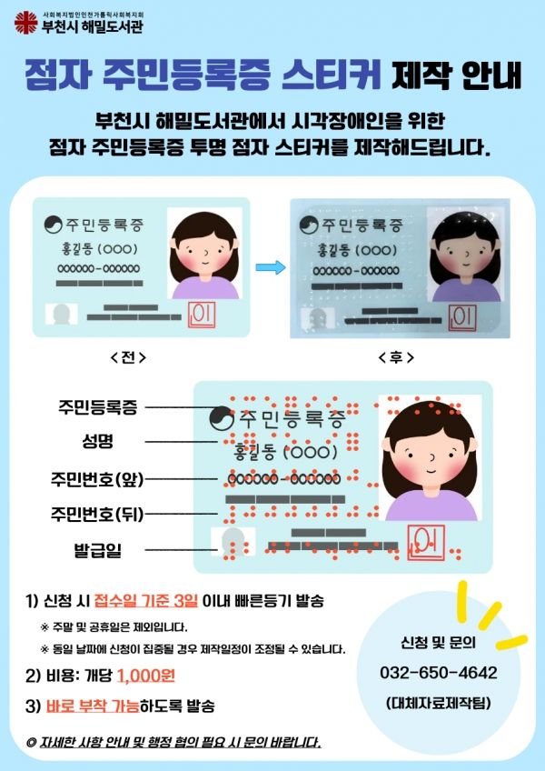 부천시 해밀도서관(이하 해밀도서관)은 시각장애인의 권리 및 생활편의 증진을 위해 점자 주민등록증 스티커를 제작하고 있다. 점자 주민등록증 스티커는 주민등록증 정보가 기재된 투명 점자 스티커로 ▲명칭(주민등록증) ▲성명 ▲주민등록번호 앞자리 ▲주민등록번호 뒷자리 ▲발급일 같은 필수 정보가 적혀 있다.
