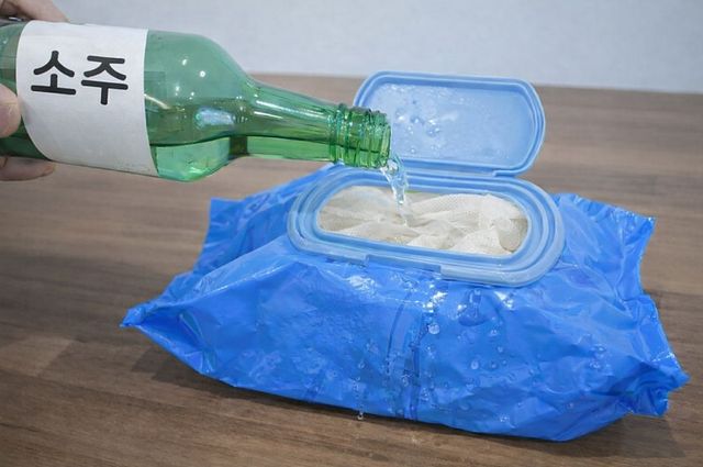 마른 물티슈에 소주를 붓는 모습. 기사 이해를 돕기 위해 AI를 활용해 제작한 자료 사진입니다. 실제 모습과 다소 차이가 있을 수 있습니다.