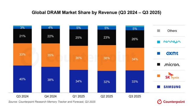 삼성전자는 지난해 4분기 점유율 40%로 SK하이닉스(51%)에 이어 2위였으나 올해 1, 2분기 점유율이 각각 13%, 15%에 그치며 마이크론에 2위 자리를 내준 바 있다. 같은 기간 마이크론은 시장 점유율을 18%, 21%를 기록했다.