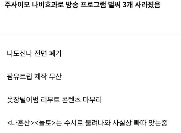 현재 일부 예능 프로그램은 출연자 논란으로 인해 콘텐츠 제작이 중단되거나 관련 회차를 삭제하는 등 후속 조치를 취하고 있다. 특히 ‘놀토’와 ‘나 혼자 산다’ 등은 수사 상황에 따라 출연자 교체 또는 방송 편성 조정을 검토 중인 것으로 전해졌다.