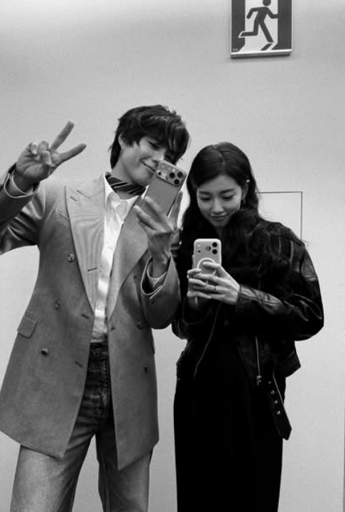 가죽 자켓을 매치해 시크하면서도 세련된 스타일을 선보인 수지는 수줍은 듯 손으로 입을 가리며 웃고 있고, 뷔는 그런 수지를 다정한 눈빛으로 바라보고 있어 마치 청춘 영화의 한 장면을 연상케 한다.