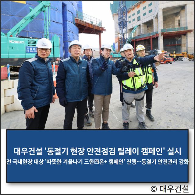 이와 동시에 대우건설은 2025년 12월부터 3개월간 전 국내 현장을 대상으로 '따뜻한 겨울나기 三한四온+ 캠페인'을 실시 중이다. 현장 안전교육과 현장 내 각종 홍보물을 통해 한랭질환 3대 예방수칙 준수를 강조하는 한편, 콘크리트 양생 작업시 일산화탄소 중독 및 질식재해 예방을 위해 갈탄 등 화석연료 사용을 금지하고, 열풍기 사용을 의무화했다.