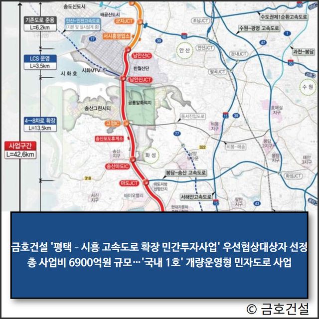 금호건설(002990)이 국토교통부가 추진하는 '평택–시흥 고속도로 확장 민간투자사업'에서 키움투자자산운용 컨소시엄의 대표 건설사로 참여해 우선협상대상자로 선정됐다.