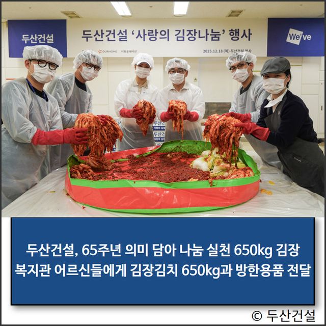 두산건설 관계자는 "창립 65주년의 의미를 나눔으로 마무리하고자 임직원과 골프단, 신입사원들이 한마음으로 김장을 담갔다"며 "앞으로도 도움이 필요한 이웃들에게 실질적인 힘이 될 수 있는 사회공헌 활동을 지속해 나가겠다"고 말했다.