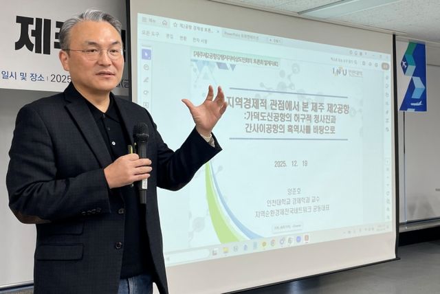 19일 ‘제주 제2공항 경제적 타당성 연속 토론회’에서 양준호 인천대학교 경제학과 교수가 발제하고 있다. 양유리기자