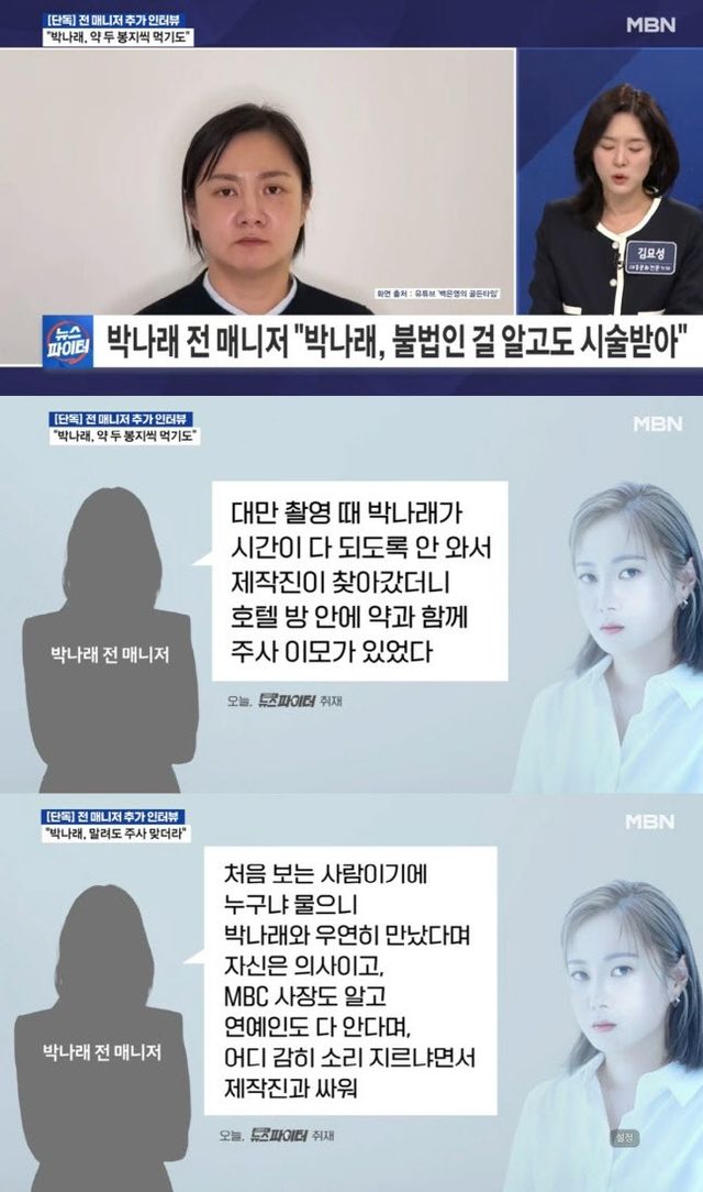 19일 방송된 MBN ‘김명준의 뉴스파이터’에서는 박나래의 전 매니저 인터뷰가 공개됐다. 전 매니저는 “대만에서 예능 프로그램 ‘나 혼자 산다’를 촬영하던 당시, 박나래가 ‘주사 이모’와 동행한 사실이 알려지면서 문제가 불거졌다”며 “불법이라는 점을 박나래 역시 알고 있었을 것”이라고 주장했다.