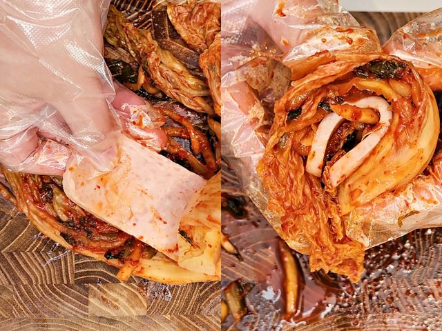 이제 김치 사이에 스팸을 하나씩 끼워 넣으면 돼요.