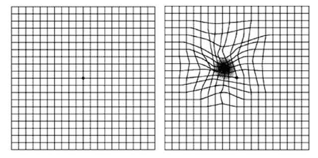 황반변성은 암슬러 격자를 통해 자가진단을 해볼 수도 있다. 바둑판처럼 생긴 종이 한가운데에 점을 찍고 그 점을 응시했을 때 바둑판무늬가 휘어지거나 찌그러져 보이거나 중심부위 암점 등의 증상이 나타난다면 황반변성을 의심해볼 수 있다. 이때는 반드시 안과에 내원하여 눈에 이상이 있는지 확인하고 증상이 없더라도 정기적으로 안과에 방문하여 검진을 받아보는 것을 권고한다.