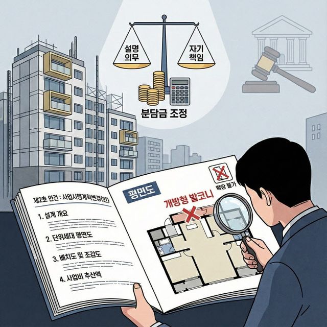 재건축 조합원이라면 앞으로 어떻게 해야 할까? “조합이 알아서 잘 해주겠지”라는 막연한 기대는 금물이다. 총회 책자에 수록된 깨알 같은 평면도, 배치도, 마감재 리스트는 단순한 그림이 아니라 내 재산의 가치를 결정짓는 법적 효력이 있는 문서다. 특히 개방형 발코니, 필로티, 측벽 등 특이 사항이 기재되어 있다면, 그것이 실제 거주나 자산 가치에 어떤 영향을 미칠지 스스로 꼼꼼히 따져보는 지혜가 필요하다. 권리 위에 잠자는 자는 보호받지 못한다는 법언은, 수십억 원이 오가는 재건축 시장에서 더욱 냉정하게 적용된다.