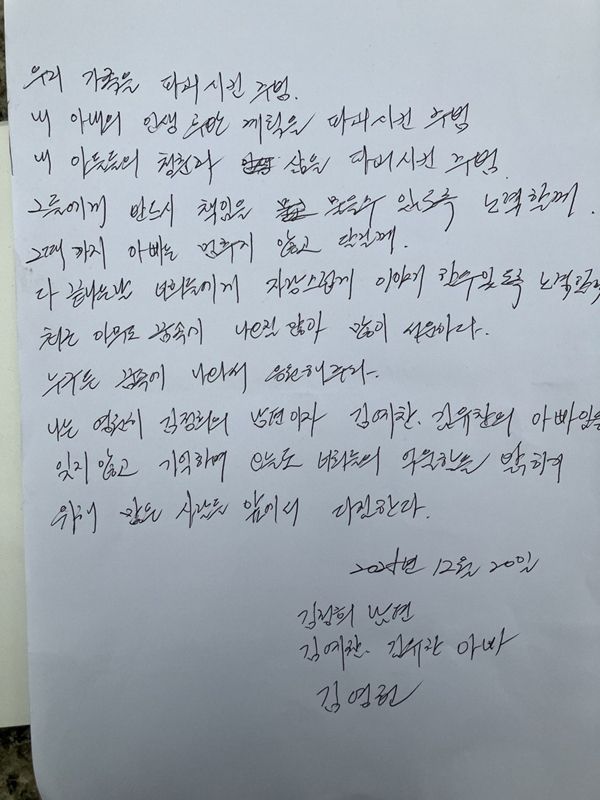 김 씨는 참사 당시 인도 남부의 한 한국 기업 법인장으로 일했다. 당시 연말을 맞아 태국에서 가족들과 만난 뒤 김 씨는 인도로, 나머지 가족들은 한국으로 귀국했다. 그리고 그날 참사로 가족을 잃었다. 김 씨는 참사 후 한국으로 돌아와 유가족협의회에서 진상규명을 위해 싸우고 있다. 김 씨의 추모 편지 전문을 싣는다.