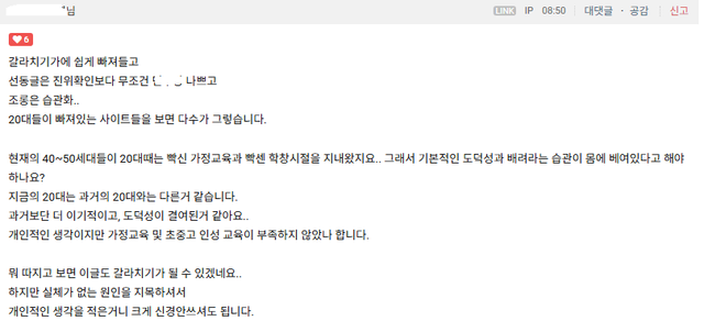 현재 40~50세대들 20대때는 빡신 가정교육과 빡센 학창시절을 지내와서 기본적인 도덕성과 배려라는 습관이 몸에 베여있다