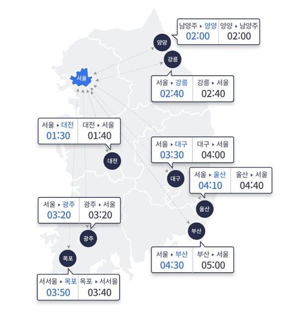 상행선은 ▲부산~서울 5시간 ▲대구~서울 4시간 ▲광주~서울 3시간20분 ▲대전~서울 1시간40분 ▲강릉~서울 2시간40분 ▲울산~서울 4시간40분 ▲목포~서서울 3시간40분이다.