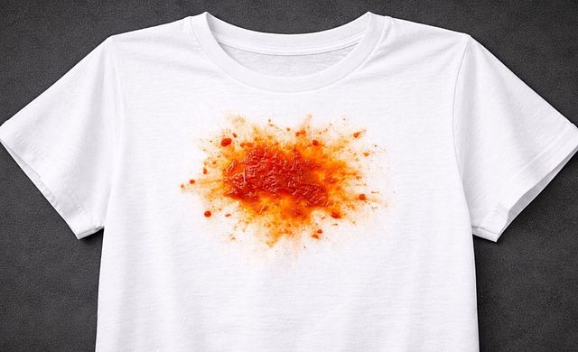 김치 얼룩이 묻은 티셔츠 모습. 기사 이해를 돕기 위해 AI를 활용해 제작한 자료 사진입니다. 실제 모습과 다소 차이가 있을 수 있습니다.