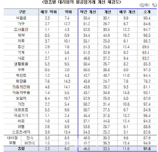 대리점거래 과정에서 불공정 관행이 전반적으로 개선된 것으로 체감한다는 응답 비율은 91.6%로 전년(91.8%) 대비 0.2%포인트 하락했다. 제약(98.5%), 주류(97.3%), 의료기기(96.4%) 업종 거래 관행 개선 체감도는 높게 나타났지만, 화장품(78.2%), 자동차판매81.1%), 스포츠·레저(82.6%) 업종 거래 관행 개선 체감도는 낮았다.