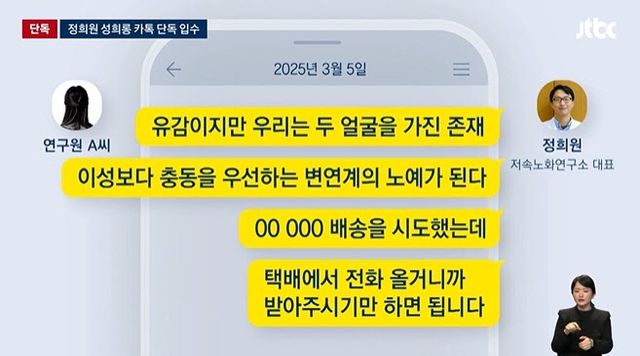 또 정 대표는 A씨에게 “우리는 두 얼굴을 가진 존재, 이성을 관장하는 전두엽보다 충동을 우선하는 변연계의 노예가 된다”고 보냈다. 변연계는 뇌에서 감정과 동기부여를 담당하는 부분이다. 그러면서 특정 물품을 주문했으니 “대신 물건을 받아달라”고도 요청했다.