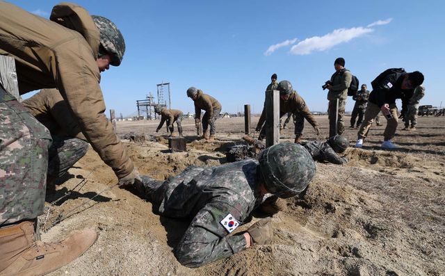 2025년 2월 18일 오후 경기 평택시 캠프 험프리스에서 샌드허스트 경연대회에 참가하는 육군사관학교 생도들이 장애물 코스 훈련을 하고 있다. / 뉴스1