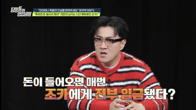 이에 도깨비 탐정단은 친모가 살았던 거주지, 집을 담보로 돈을 빌린 대부업체, 3채의 아파트 관리사무소, 그리고 함께 일했던 지인을 만나 생전 행적 추적에 나섰다. 그런데 주변인들 모두가 친모 곁에 ‘의문의 남자’의 존재를 언급했다. 심지어 “조카가 맨날 찾아와 돈을 요구했다. 집을 담보로 대출까지 받아 돈을 빌려줬다”는 충격적인 증언까지 등장했다.