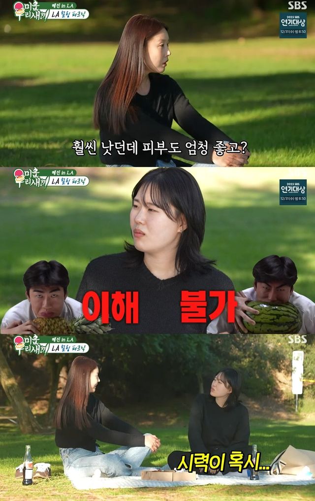 이 가운데 한혜진은 엄지윤과 힐링 LA 피크닉을 즐기기도 했다. 두 사람은 어니언 링을 큼지막히 얹은 현지 핫도그를 맛봤다.