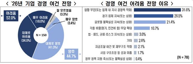 응답 기업의 과반(52.0%)은 내년 경영 여건이 어려울 것으로 전망했다. ‘매우 어려움’을 전망한 기업도 전체 응답의 18.0%로 나타났다. 반면, ‘매우 양호’를 전망한 기업은 전체 응답의 3.4%에 불과했다.