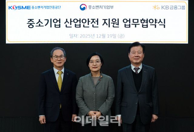 KB금융그룹은 지난 19일 서울 여의도 KB국민은행 신관에서 한성숙 중소벤처기업부(중기부) 장관, 양종희 KB금융그룹 회장, 강석진 중소벤처기업진흥공단(중진공) 이사장이 참석한 가운데 중소기업 산업현장의 안전수준을 높이기 위한 ‘중소기업 산업안전 지원 업무협약(MOU)’을 체결했다.
