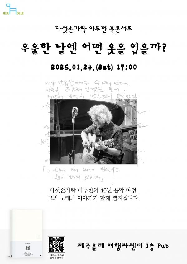 ㈔제주올레는 자신의 노래를 담은 필사집 『우울한 날엔 어떤 옷을 입을까?』를 낸 밴드 다섯손가락 이두헌의 북콘서트를 개최한다고 밝혔다.