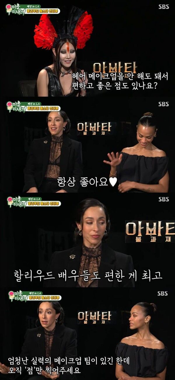 한혜진은 조 샐다나에게 "헤어와 메이크업을 하지 않아도 돼서 편하고 좋은 점이 있느냐"고 질문했다.