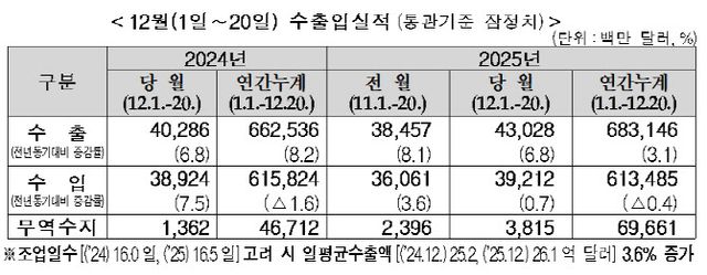 관세청이 22일 발표한 ‘2025년 12월 1~20일 수출입 현황’에 따르면 이 기간 수출액은 430억달러로 1년 전보다 6.8%(27억 4000만달러) 증가했다. 조업일수를 고려한 일평균 수출액은 3.6% 증가한 26억 1000만 달러로 집계됐다. 조업일수는 16.5일로 작년보다 0.5일 많았다.