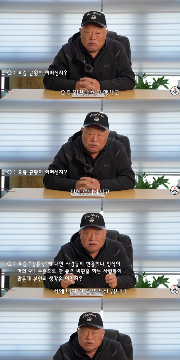 김흥국은 자신을 향한 부정적인 여론에 대해 "안 좋은 시선 알고 있다. 근데 9:1까지 된 상황은 거의 이제 바닥이라고 봐야 된다. 이걸 어떻게 회복을 할 건가 저 나름대로 고민을 많이 한다. 예전엔 참 좋았다. 요즘 날도 추운데 저에 대한 시선이 차갑다"고 인정했다.