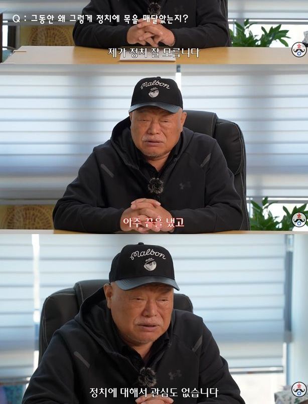 김흥국은 "정치 잘 모른다. 목을 매달 정도의 정치꾼은 아니다. 이제 정치를 안 하는 게 아니라 아주 끝을 냈다. 정치에 대해서 관심도 없다"면서도 "단지 대한민국이 잘 되고 잘 살아야 한다는 건 변함이 없다"고 했다.