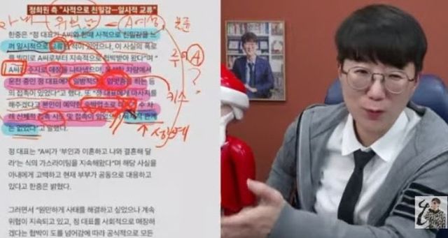 해당 영상에서 이 변호사는 정 대표 측이 공개한 입장문에 대해 “사적으로 친밀감을 느껴 일시적으로 교류했다고 하는데 최소한 아내에게 불륜 아니냐”고 지적했다.