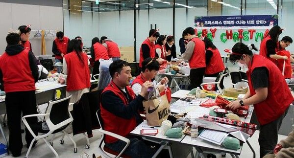 AJ네트웍스 임직원 자원봉사자 20여명은 지난 19일 지파운데이션과 협력해 크리스마스 선물 포장 봉사활동을 진행했다. 선물은 간식 꾸러미와 희망 메시지를 담은 손편지, 아이들이 직접 고른 선물로 구성됐다.